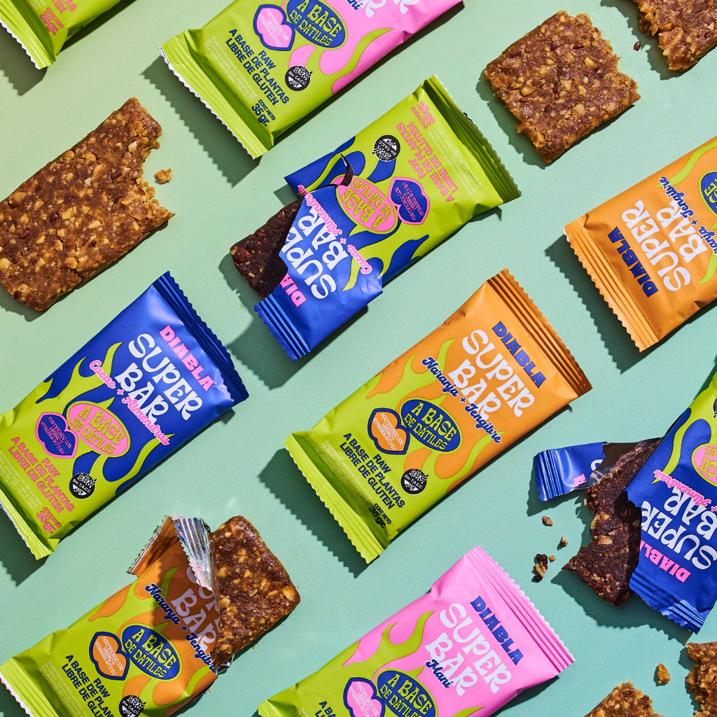 Super Bar Cacao & Almendras: dátiles, almendra, coco, cacao, lino y mezcla de vitaminas y minerales.